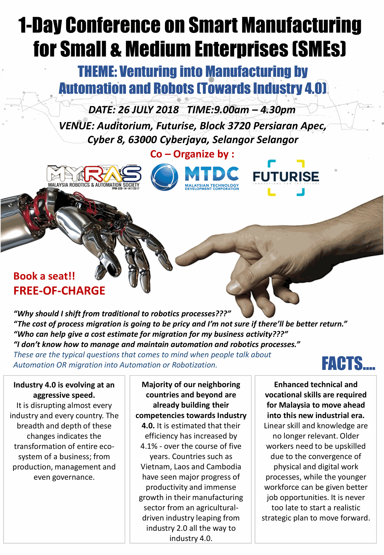 To provide an overview with possible answers for SMEs to embark onto Industry 4.0 in a practical and economical manner. Speakers from the industry, academia and government will share their knowledge, experience and views. SME’s can embark on the use of Automation and Robotics without incurring high costs and threat of job losses.