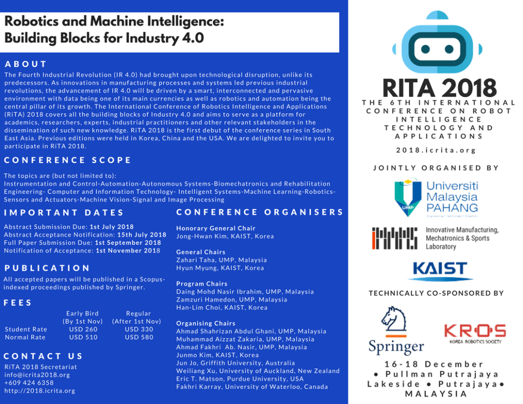 We are seeking high-quality papers in the area of Robot Intelligence Technology and Applications. Under the theme of this year’s conference, “Robotics and Machine Intelligence: Building Blocks for Industry 4.0”, RiTA2018 aims to serve as a platform for academics, researchers, experts, industrial practitioners and other relevant stakeholders in the dissemination of such new knowledge. In respect of robot intelligence technology, the conference will cover technical innovations driven by the fourth industrial revolution. This is the first debut of the conference series in Malaysia, after Korea, China and USA. We are delighted to invite you to participate in RiTA 2018.